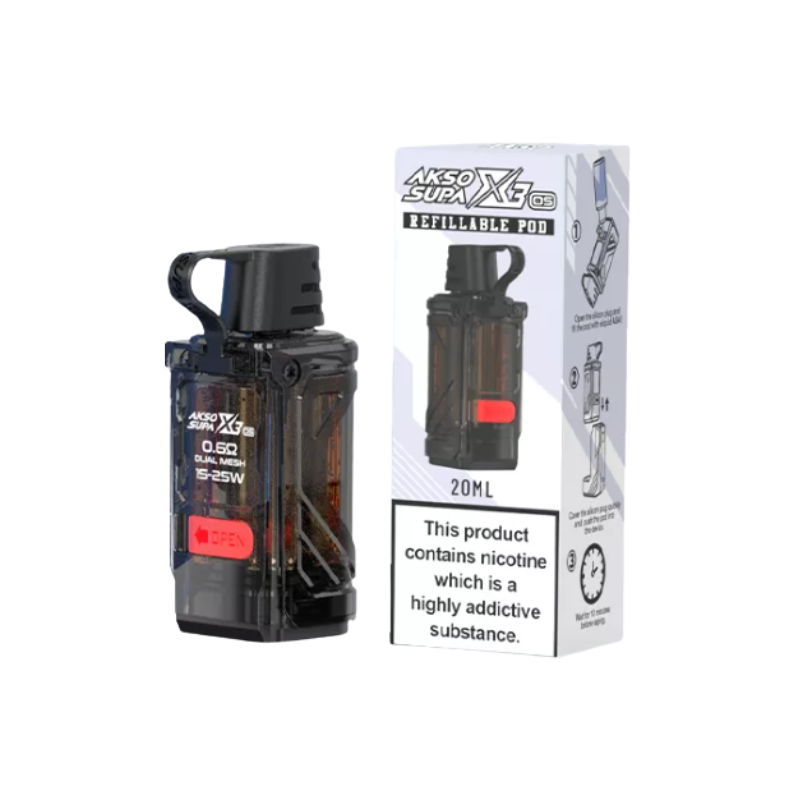 Cartouche Supa X3 vendue à l'unité de la marque AKSO pouvant contenir jusqu'à 20mL de liquide remplissable sur le côté compatible avec le Kit Pod du même nom.