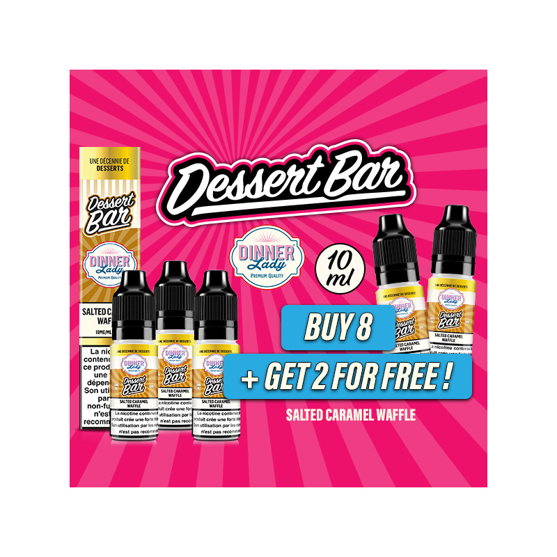 Buy 6 10mL Nic Salt Salted Caramel Waffle e-liquids from the Dessert Bar range (Waffle flavour with Salted Caramel sauce), and get 2 10mL Nic Salt e-liquids of the same flavor for free*. That’s 8 e-liquids for the price of 6, with a mix of 10mg and 20mg nicotine salt !