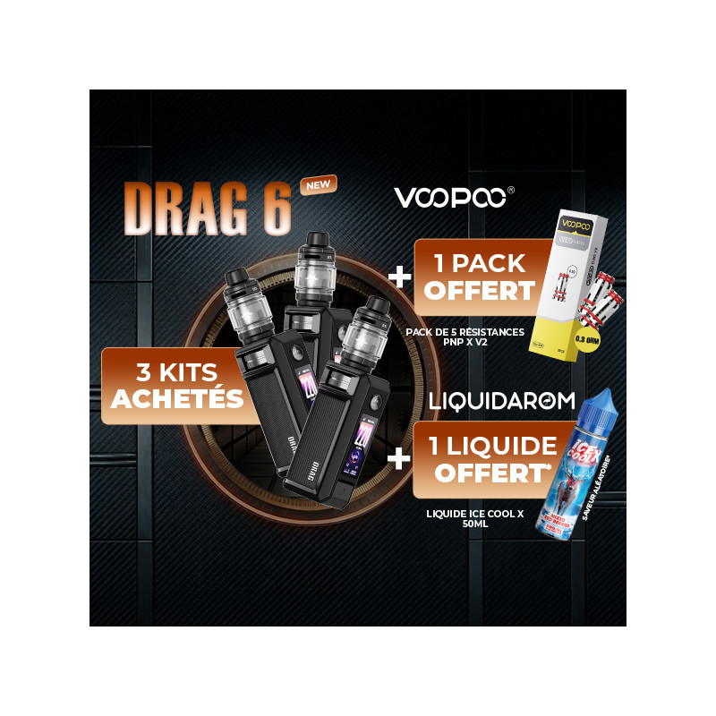 Pour l'achat de 3 Kits Drag 6 (couleur Black), recevez gratuitement* un Pack de 5 résistances PnP X V2 d'une valeur de 0.3ohm, ainsi qu'un liquide 50mL Ice Cool X by Liquidarom (saveur aléatoire), un Pack Goodies & PLV Voopoo (Chevalet, Tapis de Coil, Présentoir, etc...) ainsi qu'une participation au tirage au sort pour tenter de gagner 2 Drones.