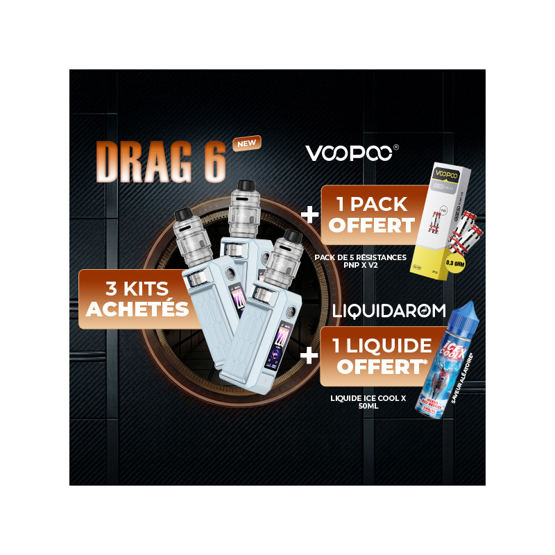 Pour l'achat de 3 Kits Drag 6 (couleur Blue), recevez gratuitement* un Pack de 5 résistances PnP X V2 d'une valeur de 0.3ohm, ainsi qu'un liquide 50mL Ice Cool X by Liquidarom (saveur aléatoire), un Pack Goodies & PLV Voopoo (Chevalet, Tapis de Coil, Présentoir, etc...) ainsi qu'une participation au tirage au sort pour tenter de gagner 2 Drones.