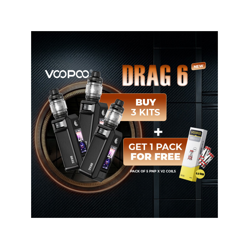 Buy 3 Drag 6 Kits (Black colour), and get a Pack of 5 PnP X V2 coils (0.3 ohm) and a Voopoo Goodies & POS Pack (coil stand, coil mat, display stand, etc.) for free* !