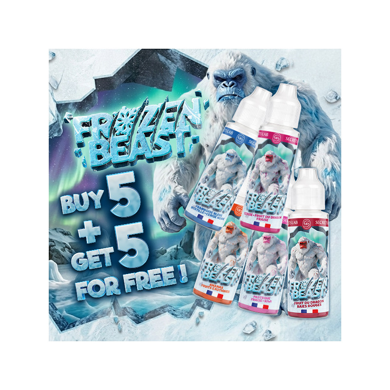 Buy the five 50mL flavors from the new Frozen Beast range by Secret's Lab, and get the same five 50mL flavors for free. That's 10 e-liquids for the price of 5 !
