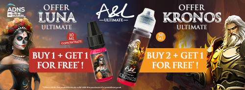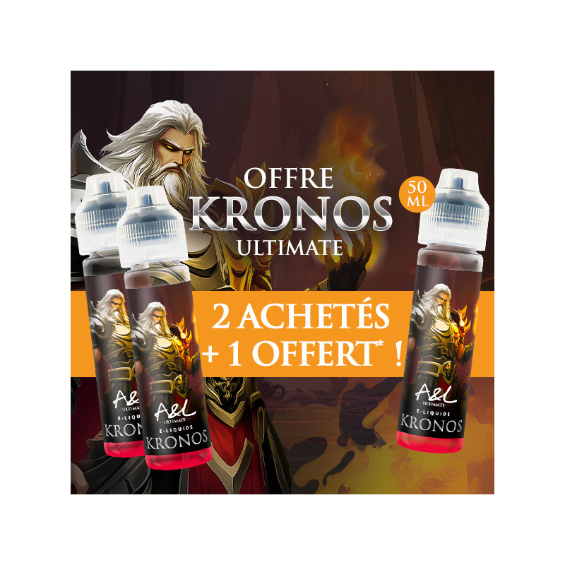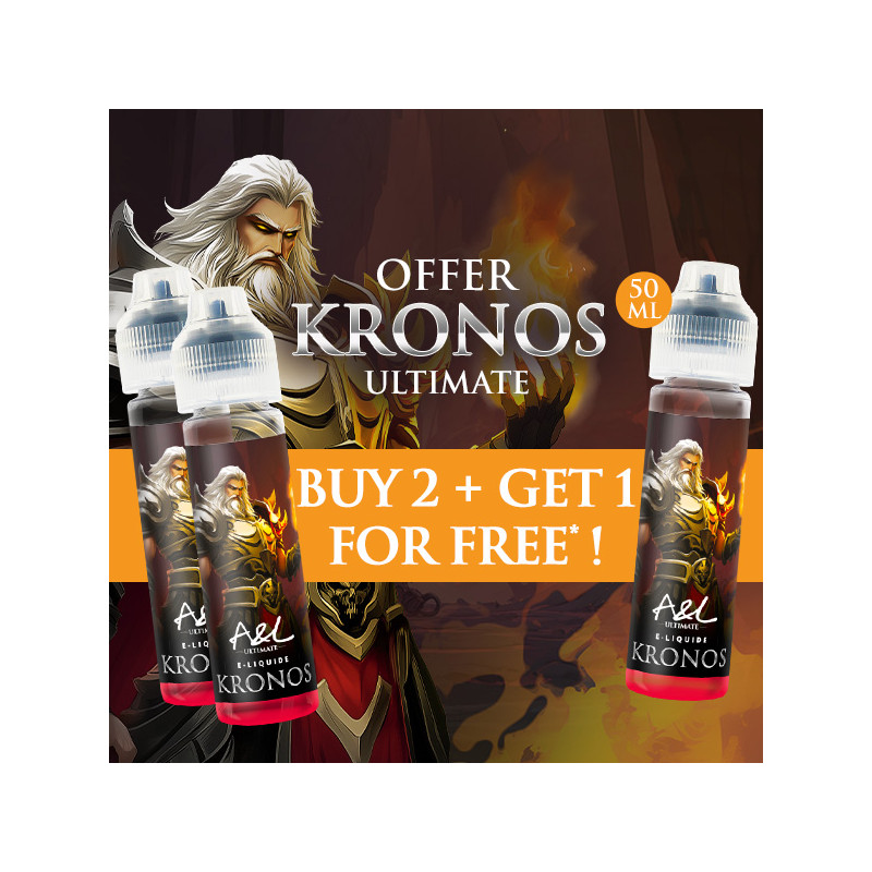 Buy 2 Kronos Ultimate 50mL liquids by A&L (Strawberry, Pomegranate, Yellow Kiwi and Freshness flavours), and get a third 50mL bottle of the same flavour for free* as well as a presentation flyer. That's 3 liquids for the price of 2 !