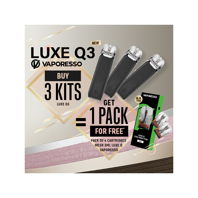 Buy 3 new Vaporesso Luxe Q3 Kits (Classic Black colour), and get a Pack of 4 Luxe Q Mesh 3mL cartridges rated at 0.6 ohms for free* !