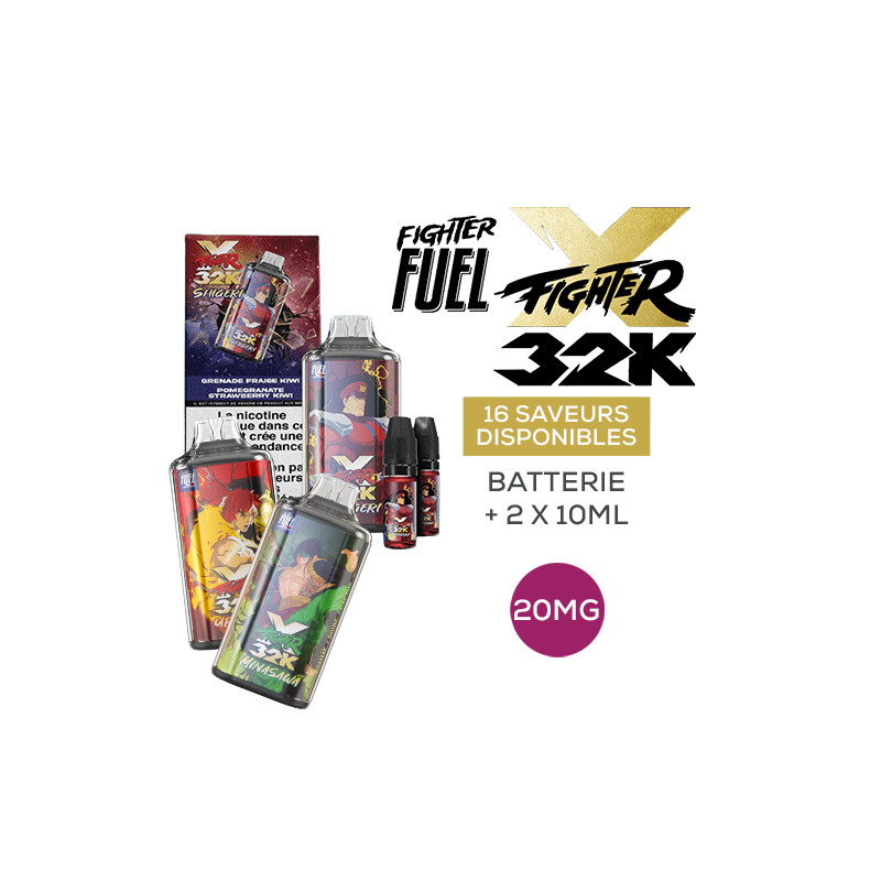 In collaboration with ASPIRE, the Fighter X 32K kit offers 1000 mAh battery life, a transparent tank and a battery display screen. Each pack includes two 10 ml bottles, for a total of 20 ml of e-liquid, good for 32k puffs!