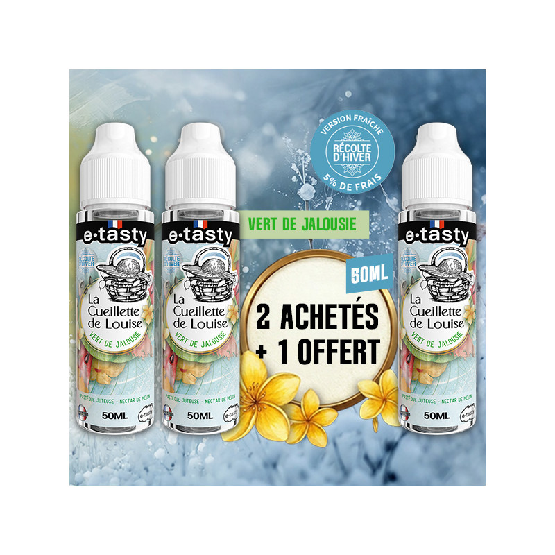 Buy two new 50mL bottles of “Vert de Jalousie Récolte d'Hiver” from La Cueillette de Louise range by E.Tasty and get a third 50mL bottle of the same flavor for free*. That’s 3 bottles for the price of 2 !