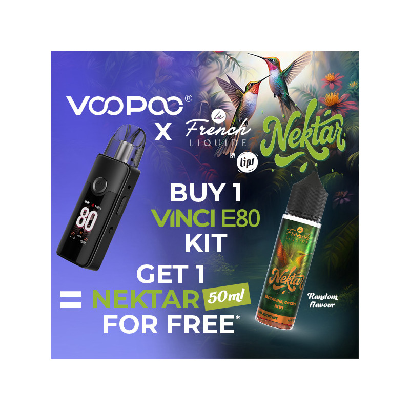Buy a Vinci E80 Kit (Spray Black color) and get a 50mL bottle of Nektar Le French Liquide by LIPS (random flavor) for free*.