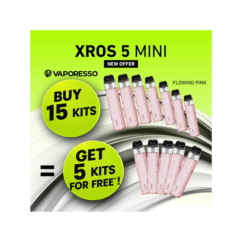 Buy 15 Vaporesso XROS 5 Mini Kits (Flowing Pink colour), and get 5 additional Kits of the same color for free. That’s 20 kits for the price of 15 !