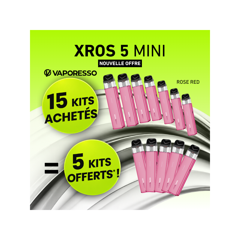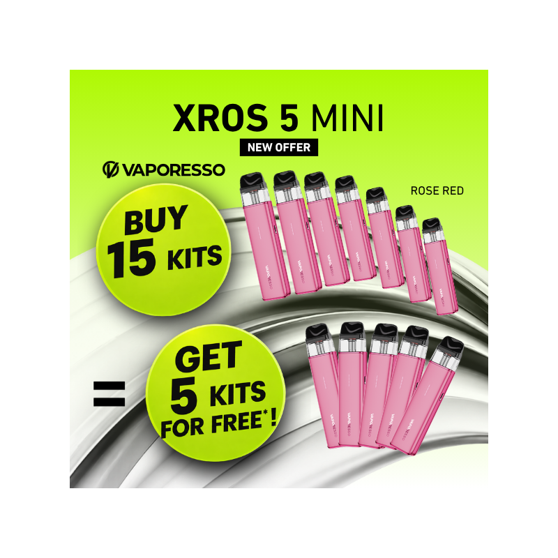 Buy 15 Vaporesso XROS 5 Mini Kits (Rose Red colour), and get 5 additional Kits of the same color for free. That’s 20 kits for the price of 15 !