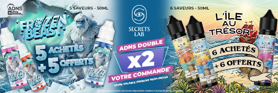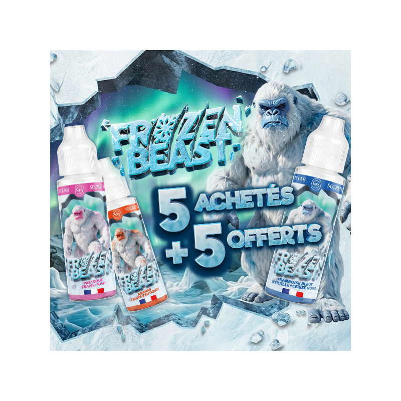 Pour l'achat des 5 saveurs 50mL de la nouvelle gamme Frozen Beast by Secret's Lab, recevez gratuitement les même 5 saveurs 50mL. Soit 10 liquides pour le prix de 5 !