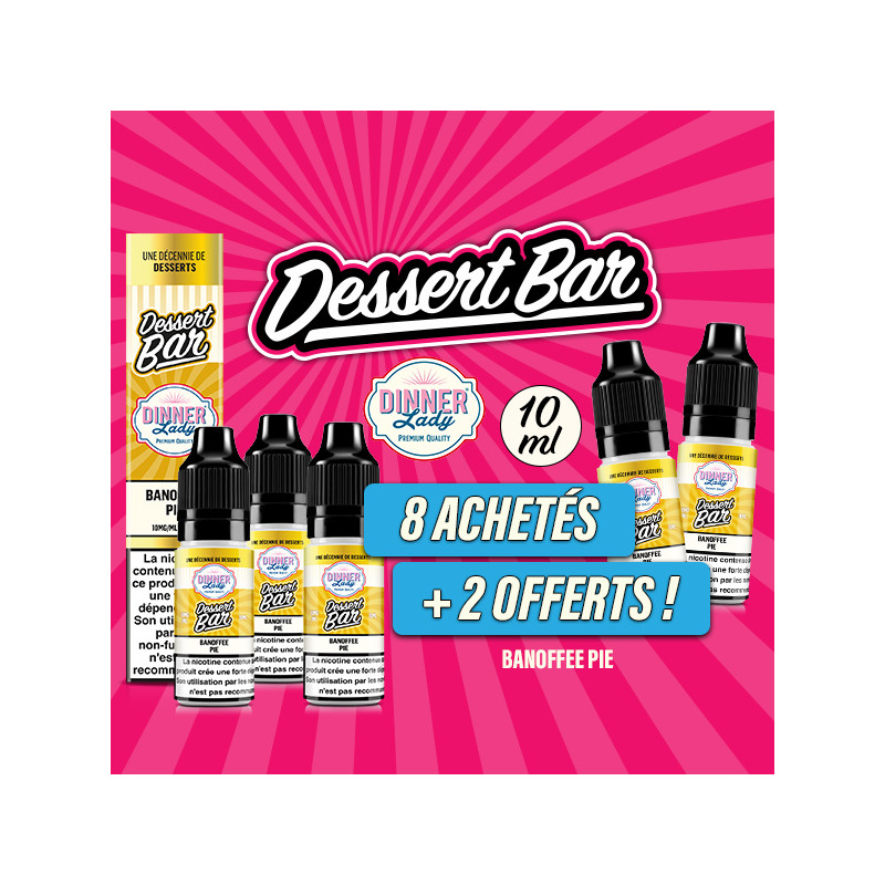 Buy 6 10mL Nic Salt Banoffee Pie e-liquids from the Dessert Bar range (Sweet Banana, rich toffee and Caramel notes with a Buttery Biscuit base), and get 2 10mL Nic Salt e-liquids of the same flavor for free*. That’s 8 e-liquids for the price of 6, with a mix of 10mg and 20mg nicotine salt !