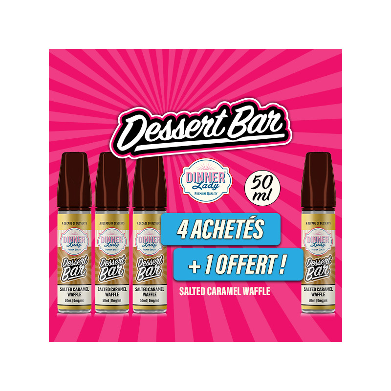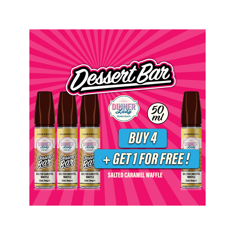 Buy 4 50mL Salted Caramel Waffle e-liquids from the Dessert Bar range (Waffle flavour with Salted Caramel sauce), and get 1 50mL e-liquid of the same flavor for free*. That’s 5 e-liquids for the price of 4 !