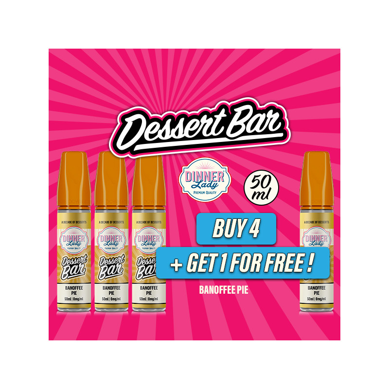 Buy 4 50mL San Sebastian Cheesecake e-liquids from the Dessert Bar range (Sweet Banana, rich toffee and Caramel notes with a Buttery Biscuit base), and get 1 50mL e-liquid of the same flavor for free*. That’s 5 e-liquids for the price of 4 !