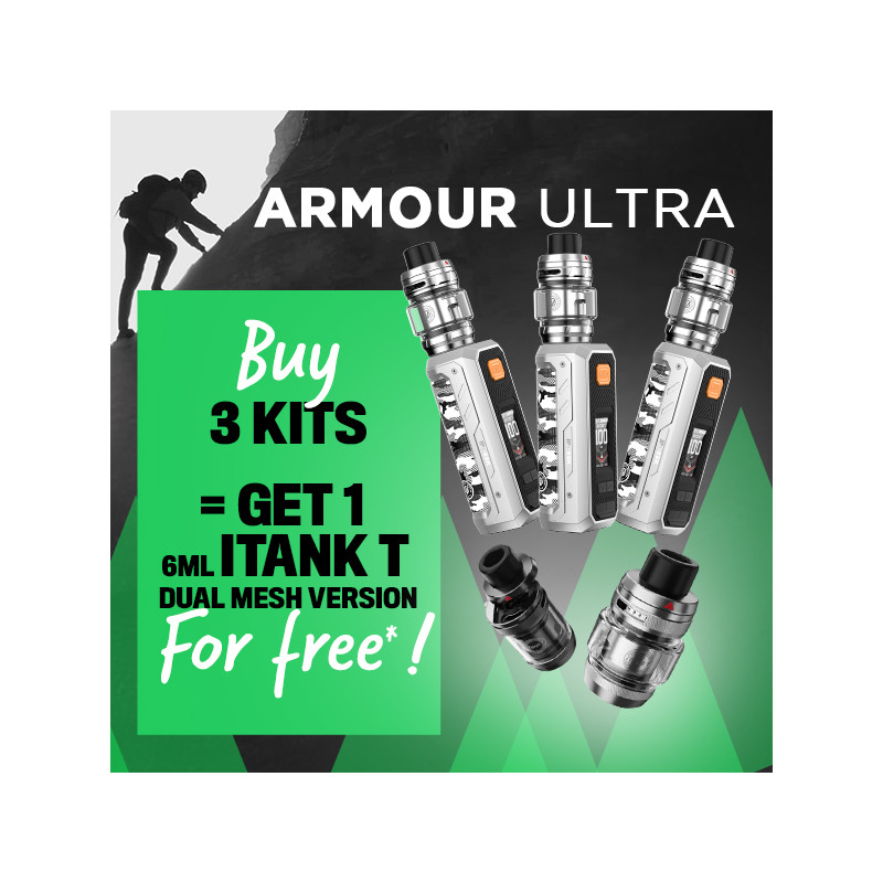 Buy 3 Armour Ultra Kits (Camo Silver color) and get a new iTank T Dual Mesh Version 6mL Atomizer from Vaporesso (random color) for free* !