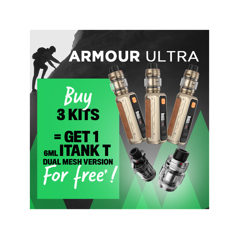 Buy 3 Armour Ultra Kits (Ultra Dune color) and get a new iTank T Dual Mesh Version 6mL Atomizer from Vaporesso (random color) for free* !