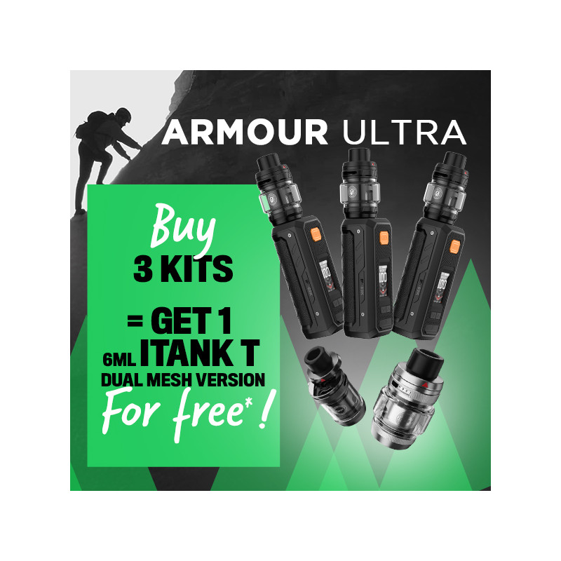 Buy 3 Armour Ultra Kits (Obsidian Black color) and get a new iTank T Dual Mesh Version 6mL Atomizer from Vaporesso (random color) for free* !