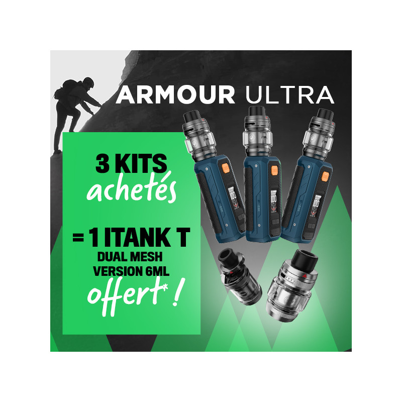 Buy 3 Armour Ultra Kits (Storm Blue color) and get a new iTank T Dual Mesh Version 6mL Atomizer from Vaporesso (random color) for free* !