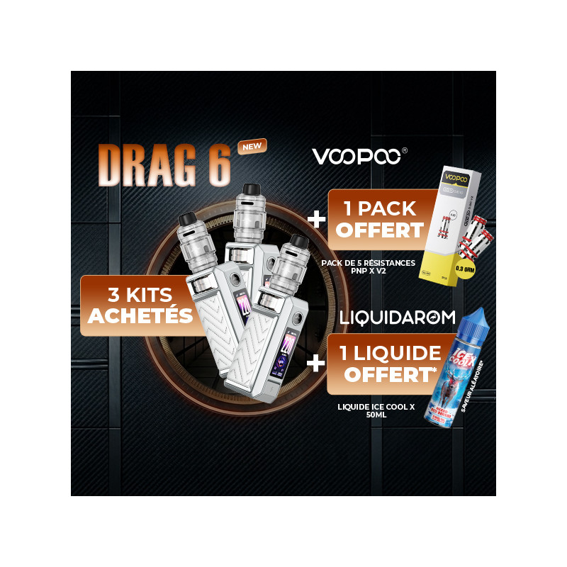 Pour l'achat de 3 Kits Drag 6 (couleur Silver), recevez gratuitement* un Pack de 5 résistances PnP X V2 d'une valeur de 0.3ohm, ainsi qu'un liquide 50mL Ice Cool X by Liquidarom (saveur aléatoire), un Pack Goodies & PLV Voopoo (Chevalet, Tapis de Coil, Présentoir, etc...) ainsi qu'une participation au tirage au sort pour tenter de gagner 2 Drones.