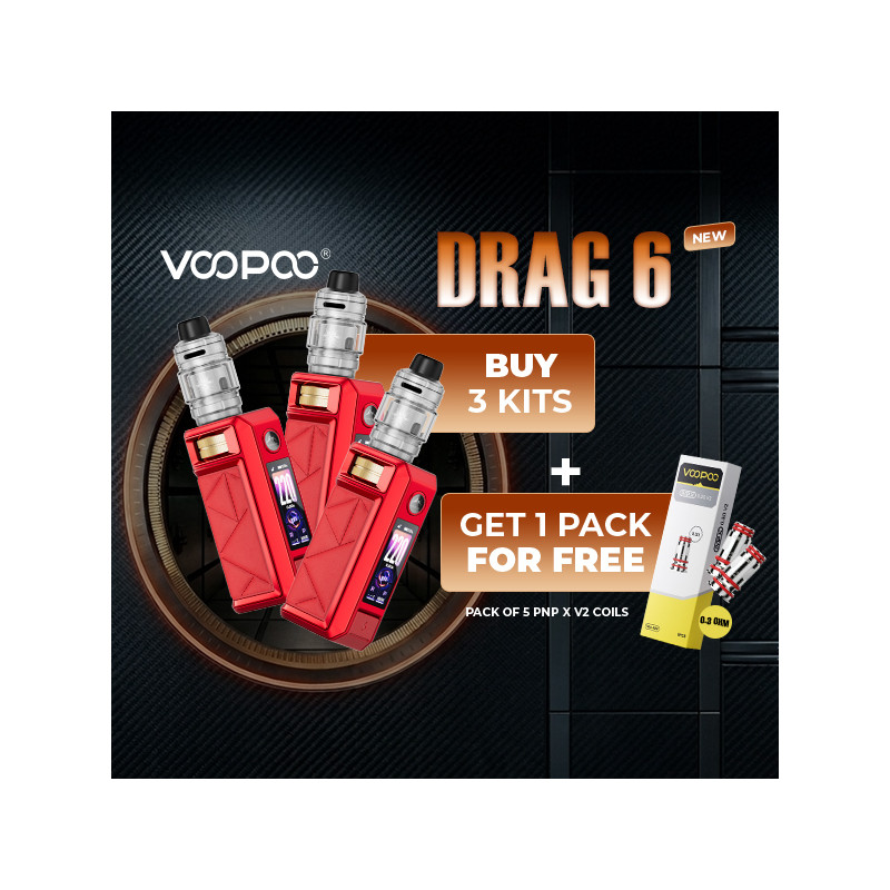 Buy 3 Drag 6 Kits (Red colour), and get a Pack of 5 PnP X V2 coils (0.3 ohm) and a Voopoo Goodies & POS Pack (coil stand, coil mat, display stand, etc.) for free* !