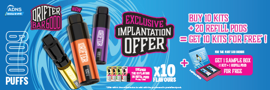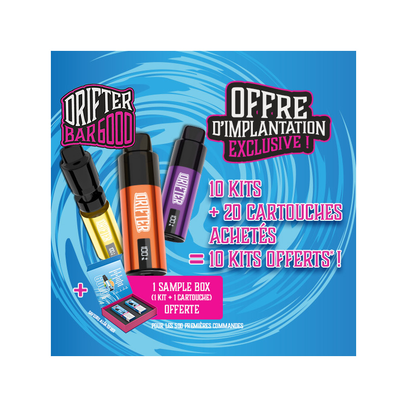 1 Drifter Bar 6000 Sample Box (1 Kit + 1 Cartridge 10+2mL 20mg random flavors) offered for the first 500 orders !
