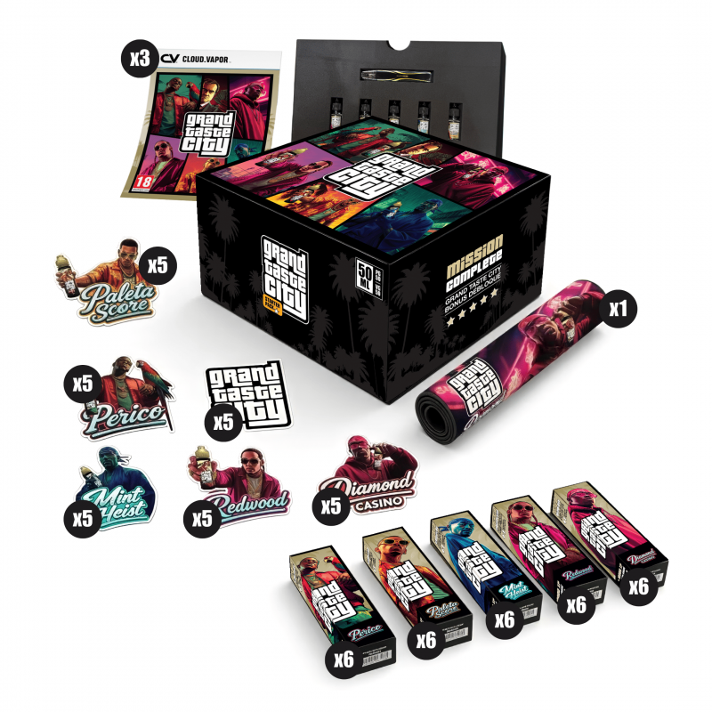 Mission complete ! You’ve unlocked the Grand Taste City Starter Pack, a 5-star pack perfect for introducing the new range from Cloud Vapor. It includes 30 GTC bottles (6 bottles of 50mL per flavor at the exceptional price of €3.30 excl. tax / 50mL), 1 OXVA XLim Pro 3 Kit with cartridges for your customers to try, 5 x 10mL 0mg samples, and plenty of Goodies and POS materials to promote the range !