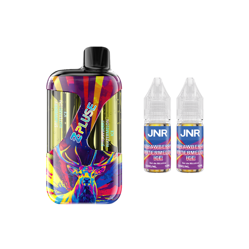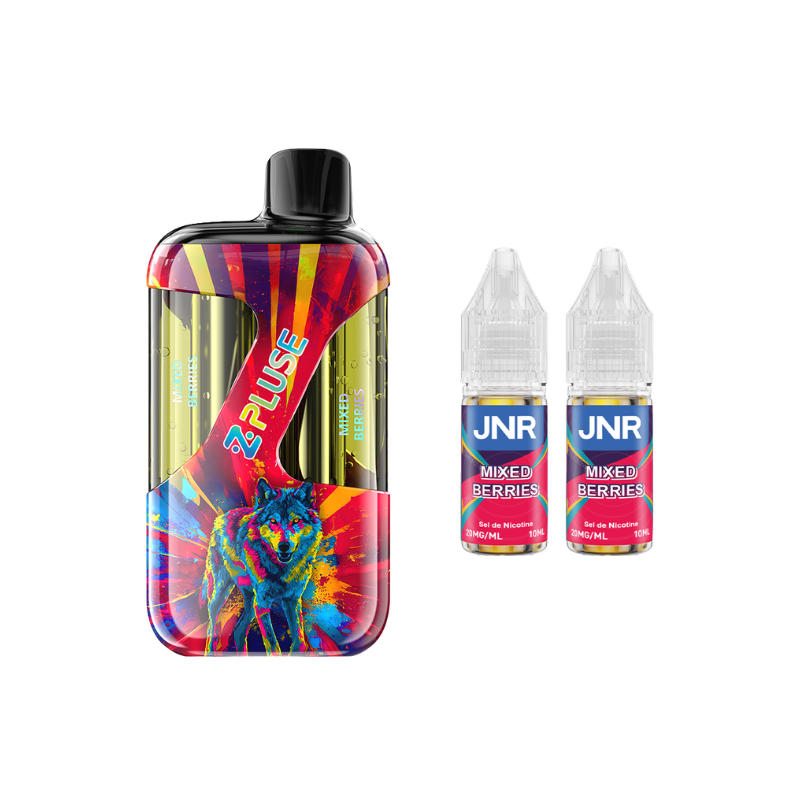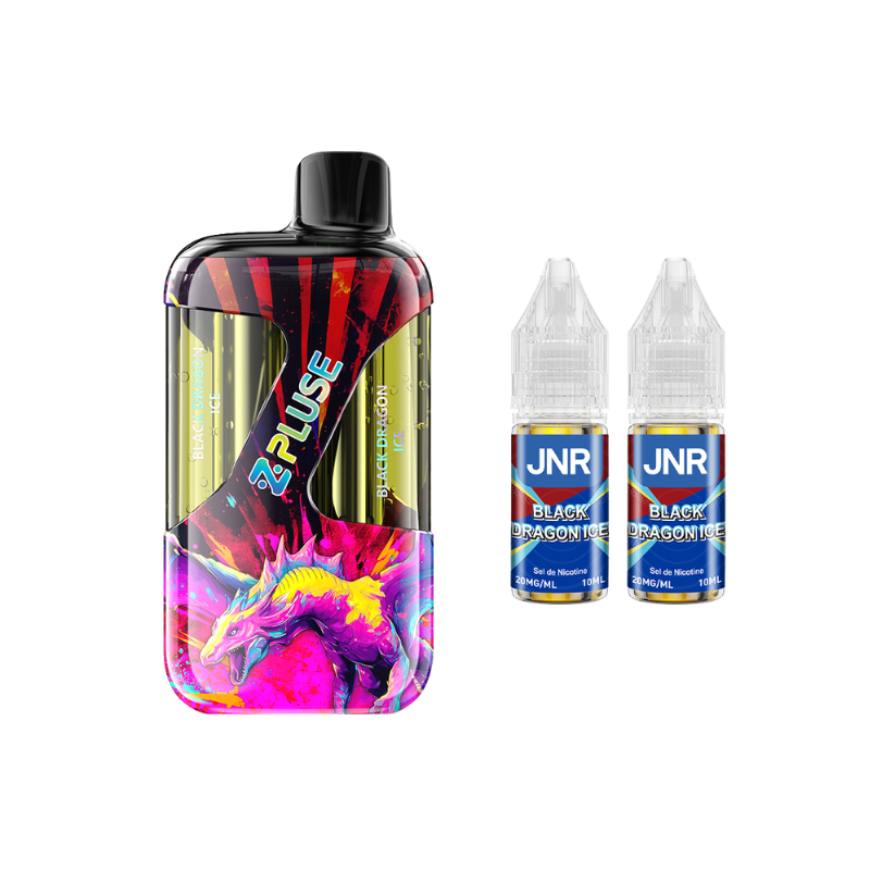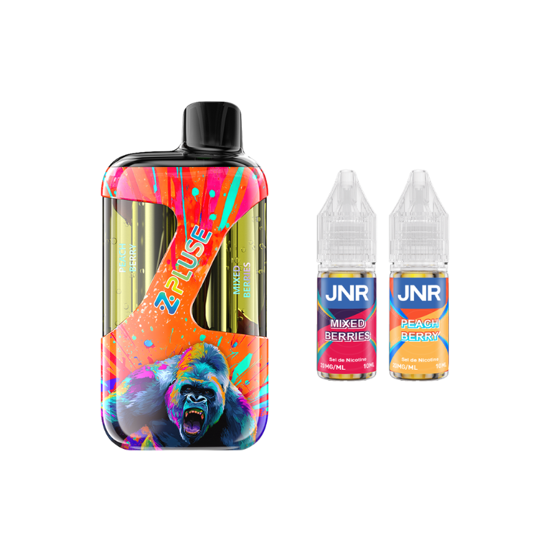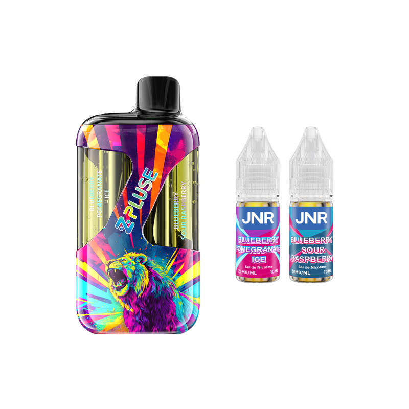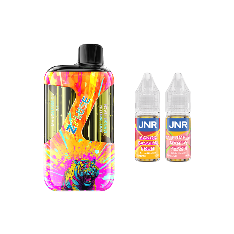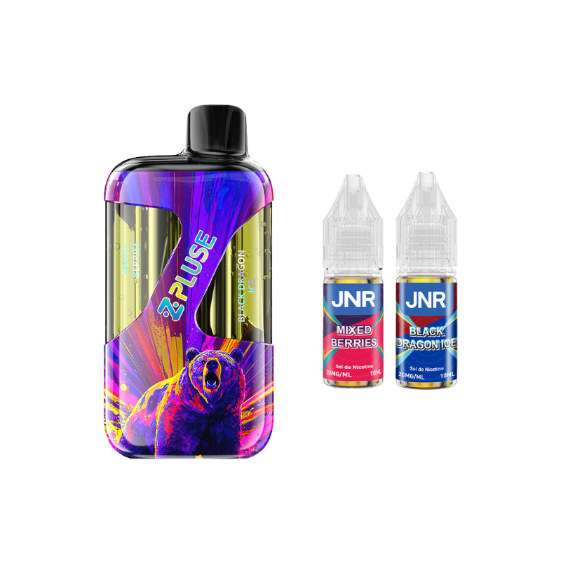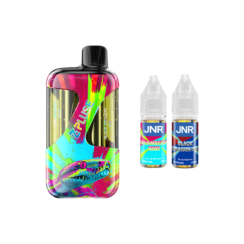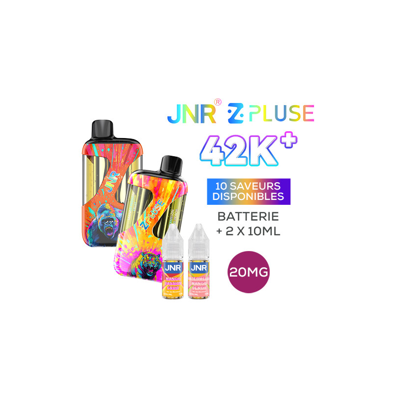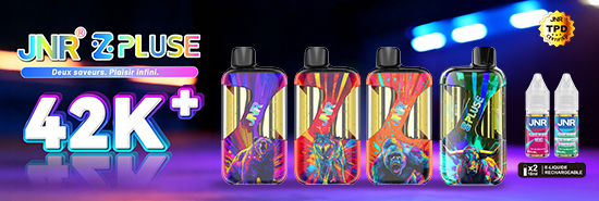 The ZPluse 42000 Kit by JNR is equipped with a built-in 1200mAh battery (rechargeable via USB-C) and a dual cartridge that can hold up to 20mL of liquid (separated into two 10mL sections), allowing you to switch between two different flavours ! The kit comes with two 10mL JNR liquids in 20mg nicotine salt (two different flavours depending on the model).