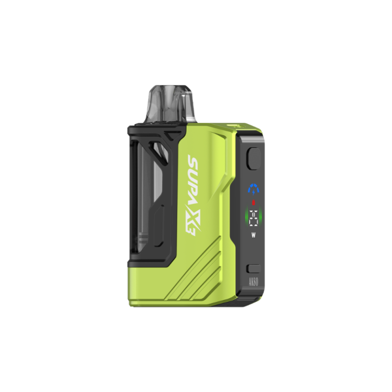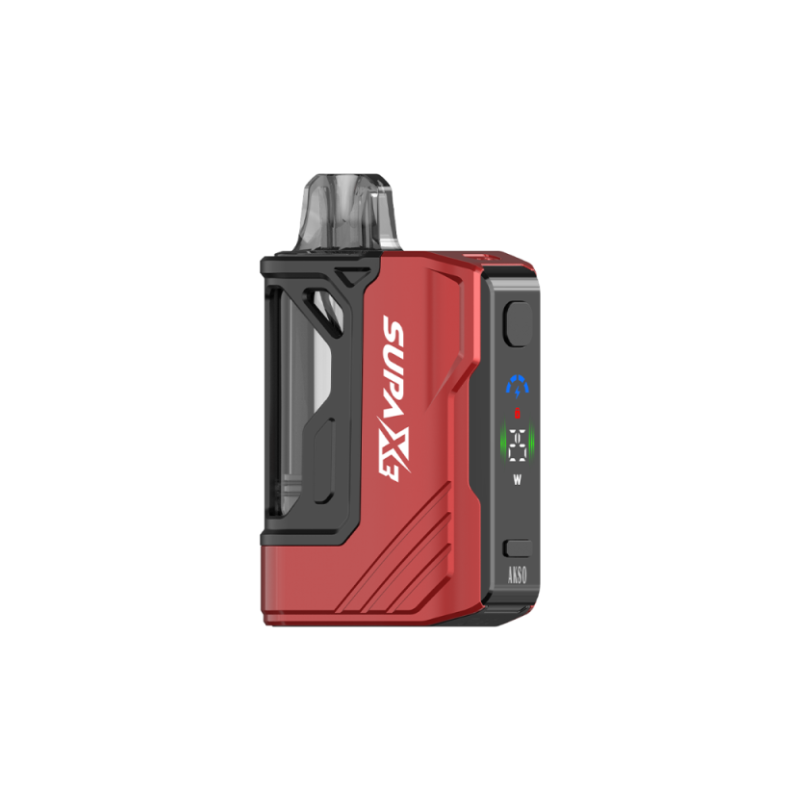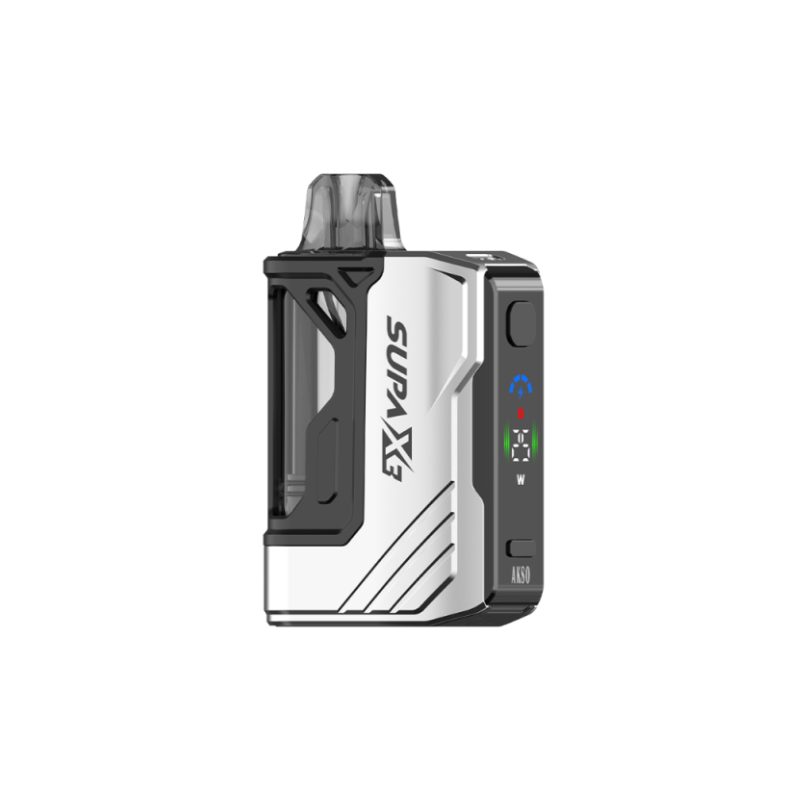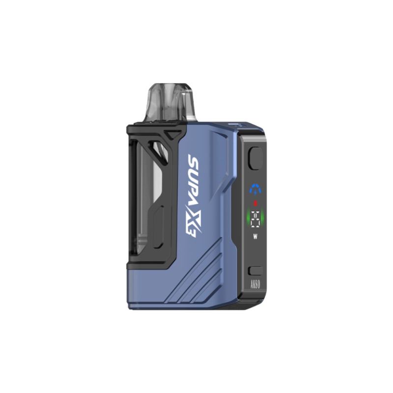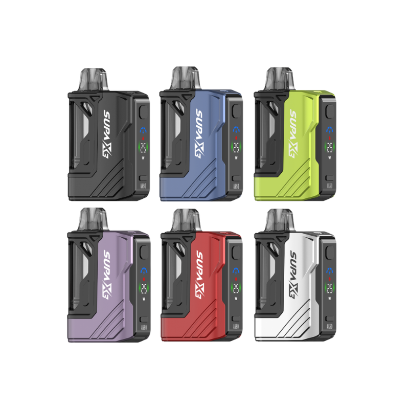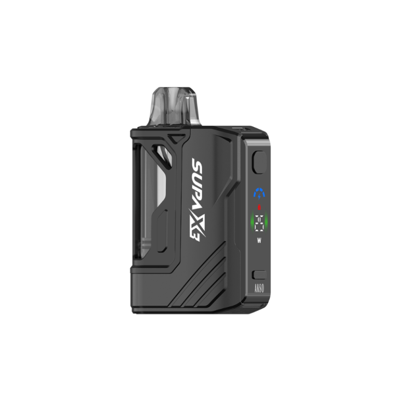 Equipped with a built-in 1000mAh battery and delivering up to 25W of power, the Supa X3 Kit is an Open System Pod with a replaceable Double Mesh Coil cartridge that can hold up to 20mL of liquid and is refillable from the side.