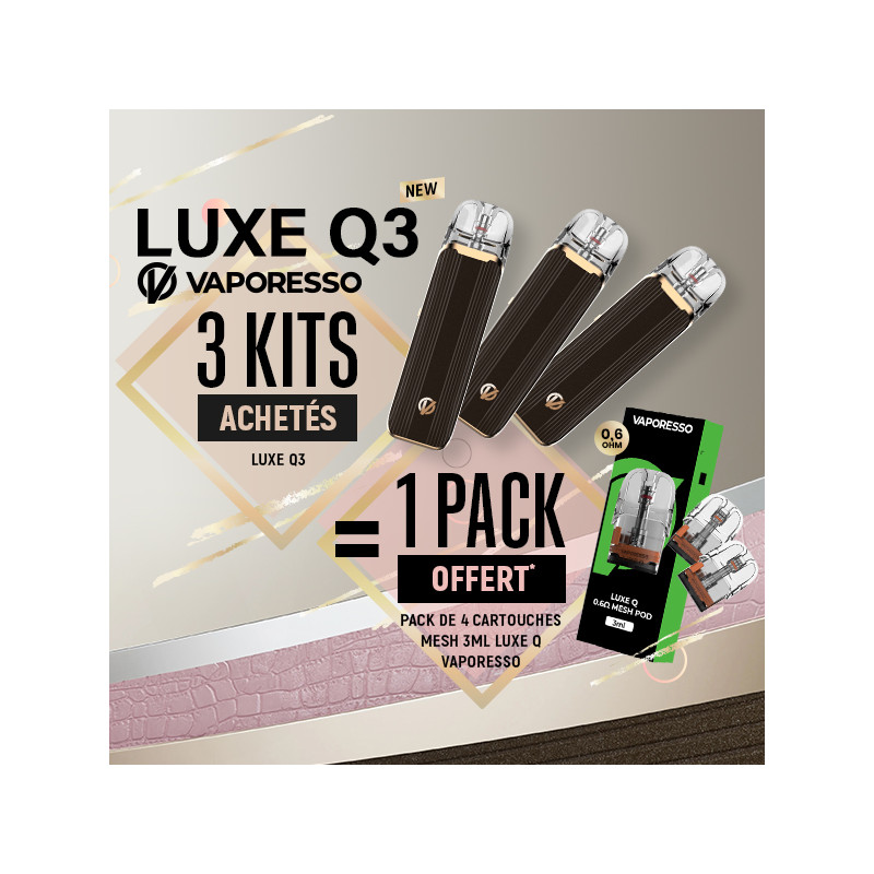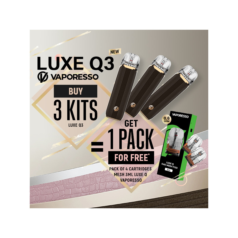 Buy 3 new Vaporesso Luxe Q3 Kits (Mocha Brown colour), and get a Pack of 4 Luxe Q Mesh 3mL cartridges rated at 0.6 ohms for free* !