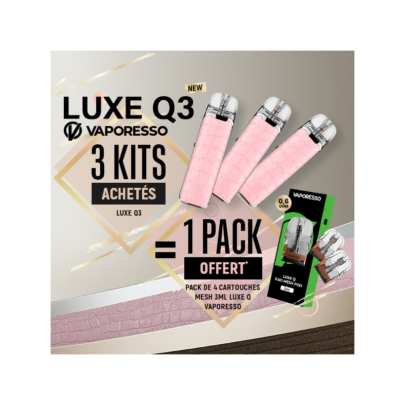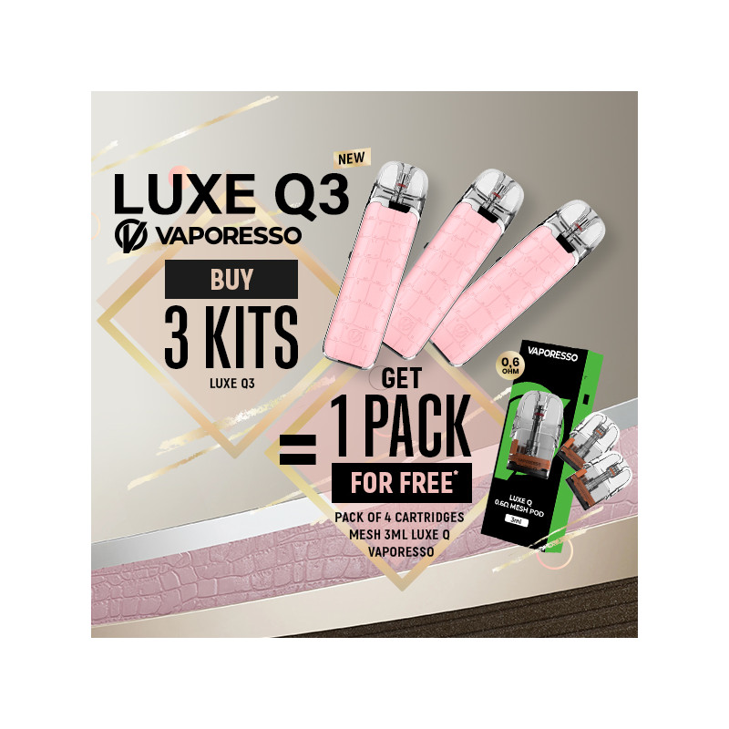 Buy 3 new Vaporesso Luxe Q3 Kits (Rose Pink colour), and get a Pack of 4 Luxe Q Mesh 3mL cartridges rated at 0.6 ohms for free* !