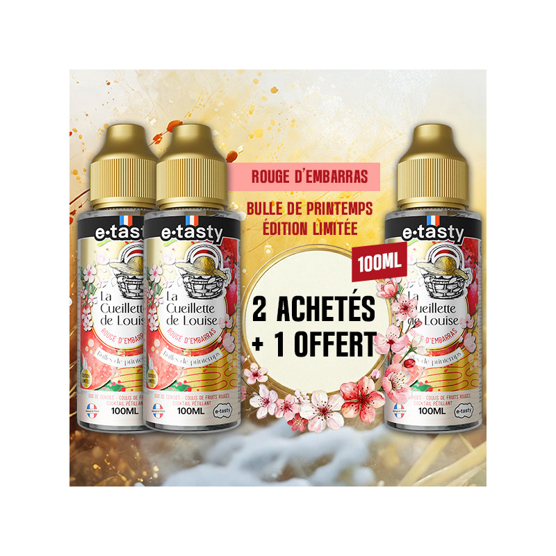 Buy two new 100mL bottles of “Rouge d'Embarras Limited Edition” from the La Cueillette de Louise range by E.Tasty and get a third 100mL bottle of the same flavor for free*. That’s 3 bottles for the price of 2 !