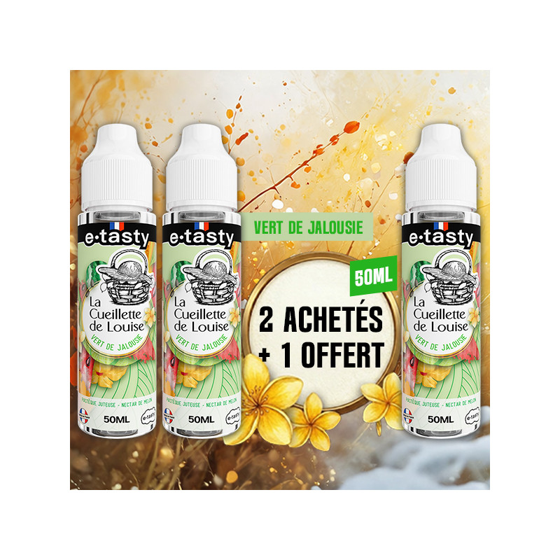 Buy two new 50mL bottles of “Vert de Jalousie” from the La Cueillette de Louise range by E.Tasty and get a third 50mL bottle of the same flavor for free*. That’s 3 bottles for the price of 2 !