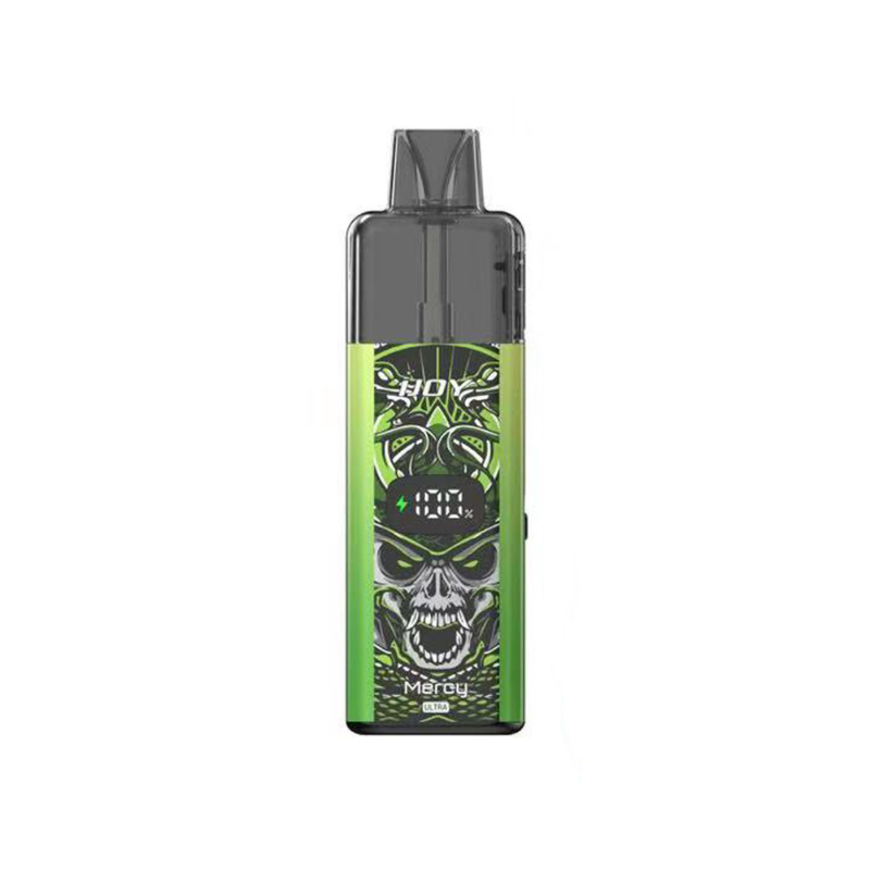 Le Kit Mercy Ultra est doté d'une batterie amovible de 1400mAh. Le kit est compatible avec les cartouches Mercy Ultra de la même marque pouvant contenir jusqu'à 10ml de liquide. Ces cartouches sont remplissables jusqu'à 4 fois pour un total de 40ml. Le kit est rechargeable via le port USB-C situé en dessous.