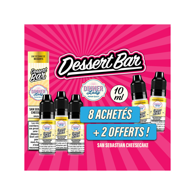 Pour l'achat de 6 liquides 10mL Nic Salt San Sebastian Cheesecake de la gamme Dessert Bar (saveur Cheesecake avec coulis de Caramel), recevez gratuitement 2 liquides 10mL Nic Salt de la même saveur. Soit 8 liquides pour le prix de 6 avec un mix de 10mg et de 20mg en sel de nicotine !