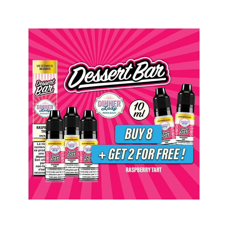 Pour l'achat de 6 liquides 10mL Nic Salt Raspberry Tart de la gamme Dessert Bar (saveur de Pâte dorée avec de la Confiture de Framboise), recevez gratuitement 2 liquides 10mL Nic Salt de la même saveur. Soit 8 liquides pour le prix de 6 avec un mix de 10mg et de 20mg en sel de nicotine !