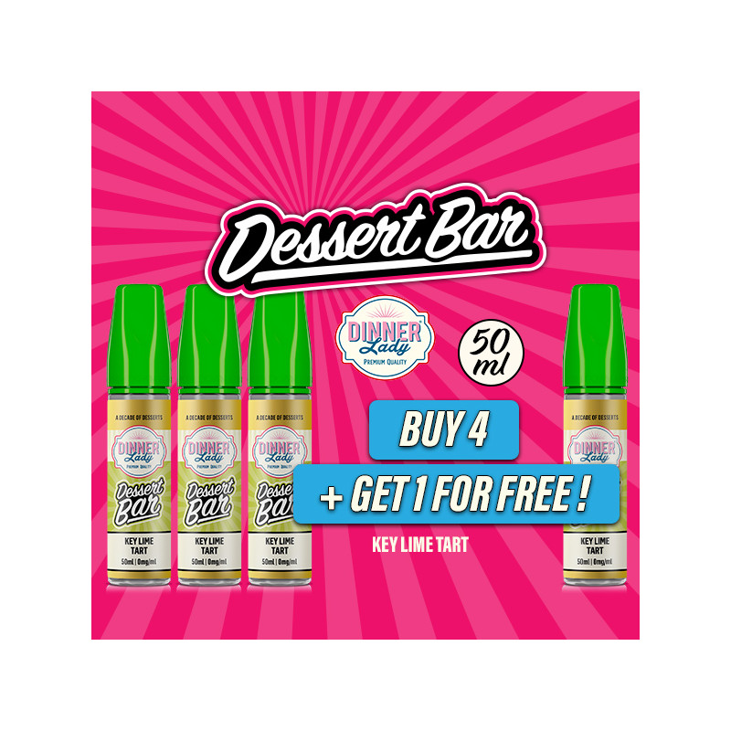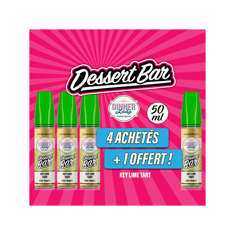 Pour l'achat de 4 liquides 50mL Key Lime Tart de la gamme Dessert Bar (une saveur de Pâte feuilletée fourrée à la Crème de Citron Vert), recevez gratuitement 1 liquide 50mL de la même saveur. Soit 5 liquides pour le prix de 4 !