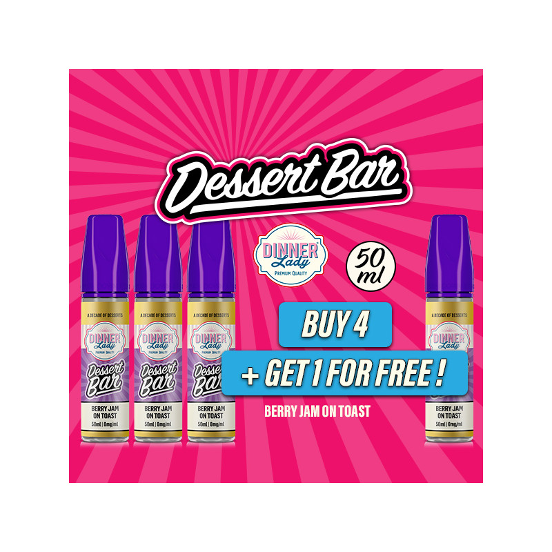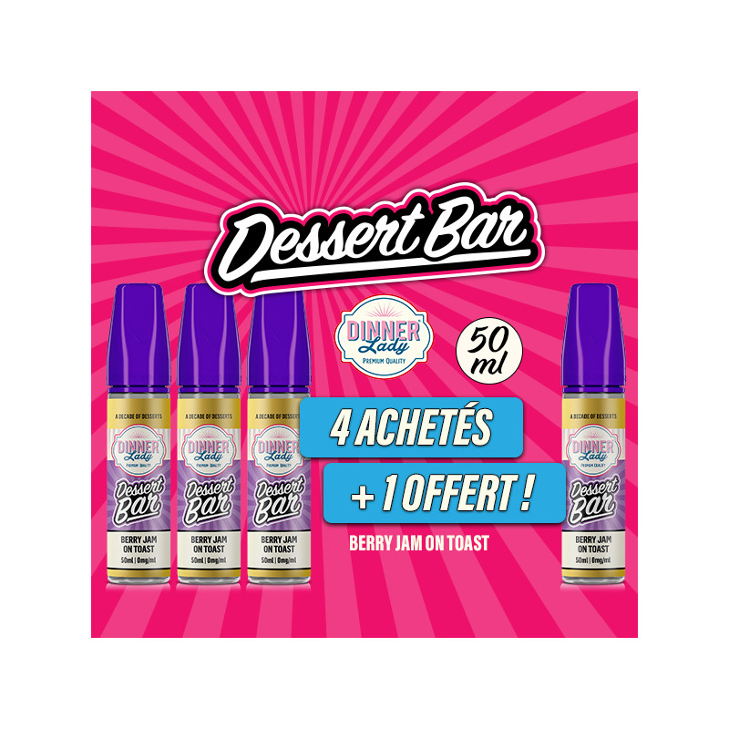 Pour l'achat de 4 liquides 50mL Berry Jam On Toast de la gamme Dessert Bar (saveur Toast Grillé avec une Confiture de Baies acidulées), recevez gratuitement 1 liquide 50mL de la même saveur. Soit 5 liquides pour le prix de 4 !