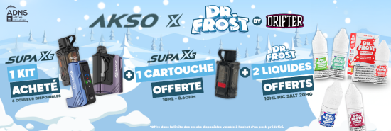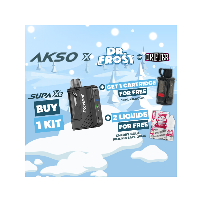 Pour l'achat d'un Kit Supa X3 d'AKSO (couleur Black), recevez gratuitement* une Cartouche 10mL Supa X3 (en 0.6ohm) ainsi que 2 liquides 10mL Nic Salt Dr. Frost en 20mg (saveur Cola Cerise) !