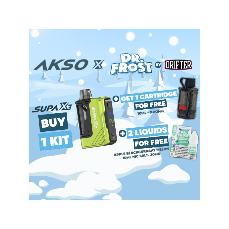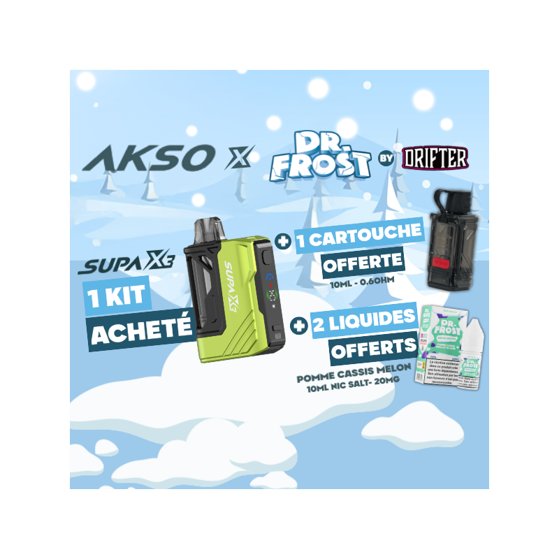 Pour l'achat d'un Kit Supa X3 d'AKSO (couleur Green), recevez gratuitement* une Cartouche 20mL Supa X3 (en 0.6ohm) ainsi que 2 liquides 10mL Nic Salt Dr. Frost en 20mg (saveur Pomme Cassis Melon) !