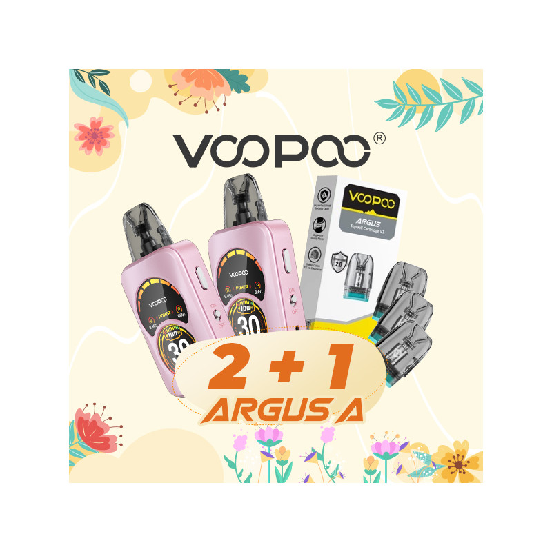 Pour l'achat de 2 Kits Argus A de Voopoo (couleur Crystal Pink), recevez gratuitement un Pack de 3 Cartouches 3mL Argus Top-Fill V2 d'une valeur de 0.4ohm.