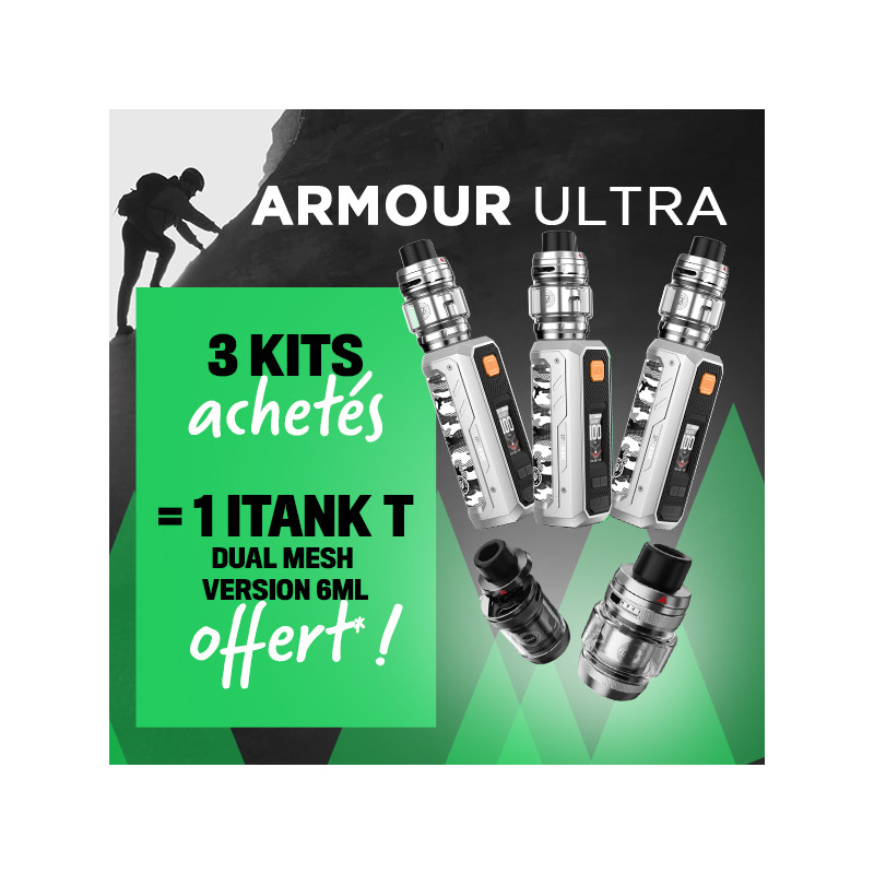 Pour l'achat de 3 Kits Armour Ultra (couleur Camo Silver), recevez gratuitement* le nouvel Atomiseur iTank T Dual Mesh Version 6mL de Vaporesso (couleur aléatoire).