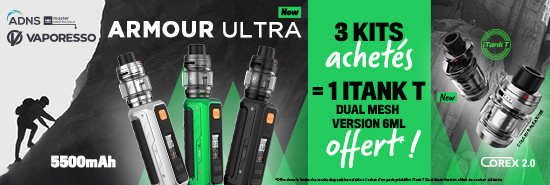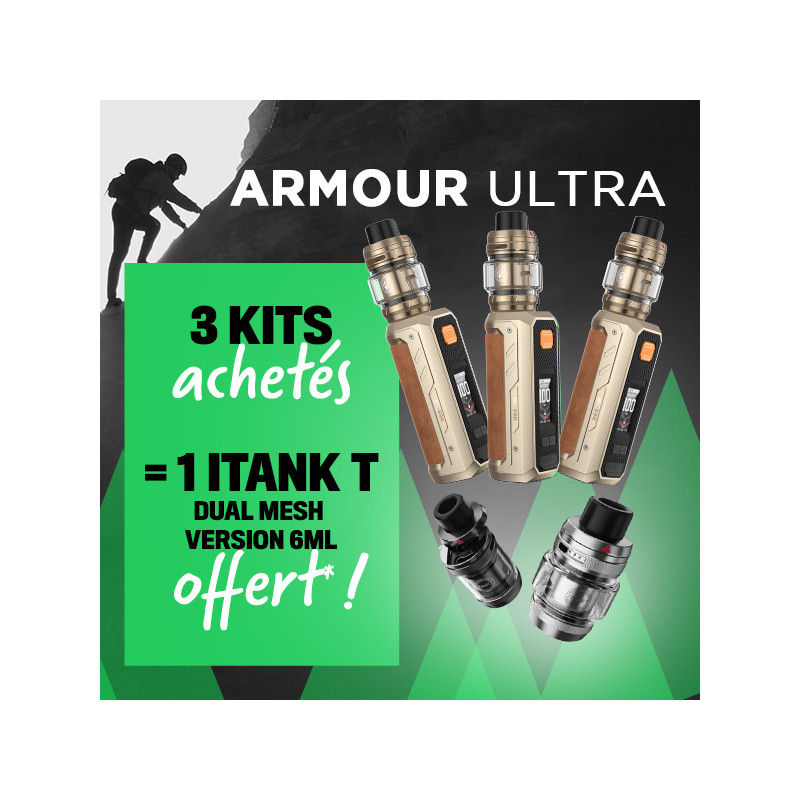 Pour l'achat de 3 Kits Armour Ultra (couleur Ultra Dune), recevez gratuitement* le nouvel Atomiseur iTank T Dual Mesh Version 6mL de Vaporesso (couleur aléatoire).