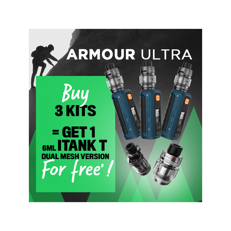 Pour l'achat de 3 Kits Armour Ultra (couleur Storm Blue), recevez gratuitement* le nouvel Atomiseur iTank T Dual Mesh Version 6mL de Vaporesso (couleur aléatoire).