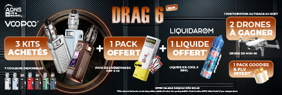 Pour l'achat de 3 Kits Drag 6 (couleur Silver), recevez gratuitement* un Pack de 5 résistances PnP X V2 d'une valeur de 0.3ohm, ainsi qu'un liquide 50mL Ice Cool X by Liquidarom (saveur aléatoire), un Pack Goodies & PLV Voopoo (Chevalet, Tapis de Coil, Présentoir, etc...) ainsi qu'une participation au tirage au sort pour tenter de gagner 2 Drones.
