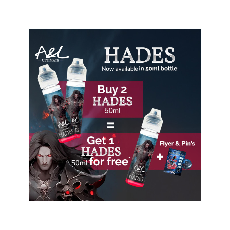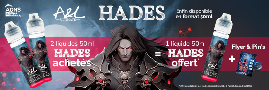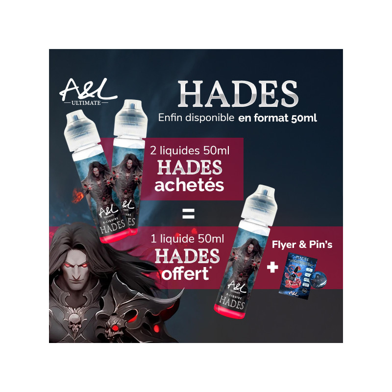 Pour l'achat de 2 liquides HADES Ultimate 50mL by A&L, recevez gratuitement* 1 liquide HADES Ultimate 50mL ainsi qu'un Flyer et un Pin's !