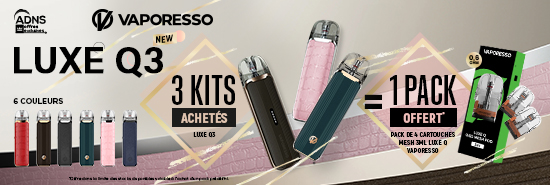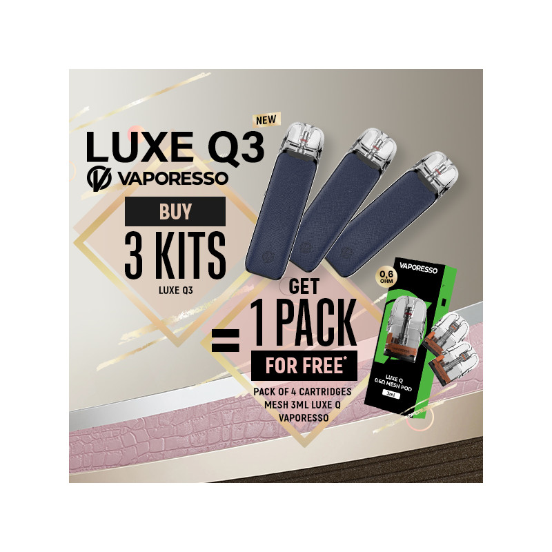 Pour l'achat de 3 nouveaux Kits Luxe Q3 de Vaporesso (couleur Prussian Blue), recevez gratuitement* un Pack de 4 cartouches 3mL Mesh Luxe Q d'une valeur de 0.6ohm.