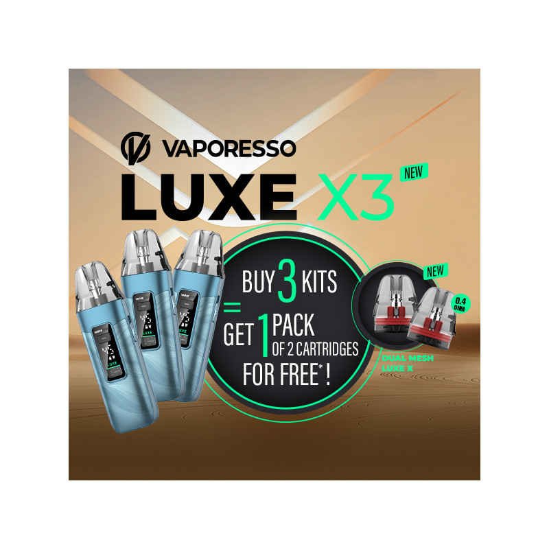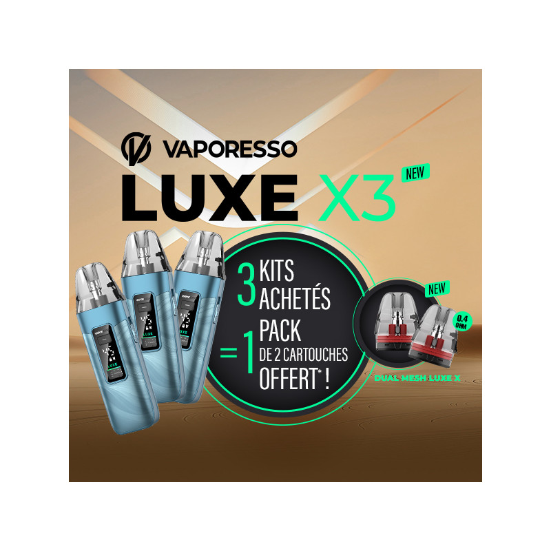 Pour l'achat de 3 Kits Luxe X3 (couleur Fluid Blue), recevez gratuitement* 1 Pack de 2 Cartouches 5mL Dual Mesh Luxe X de Vaporesso d'une valeur de 0.4ohm !