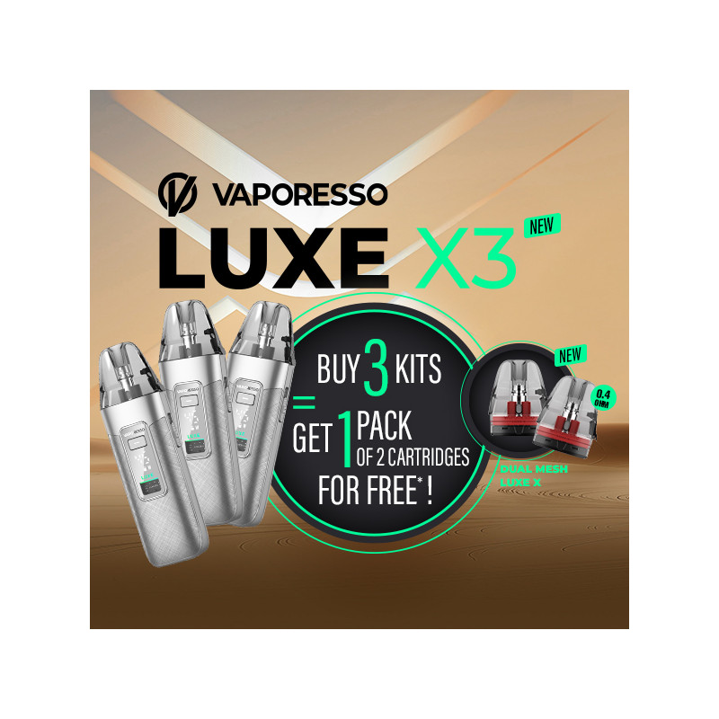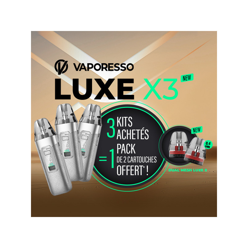 Pour l'achat de 3 Kits Luxe X3 (couleur Grey Silk), recevez gratuitement* 1 Pack de 2 Cartouches 5mL Dual Mesh Luxe X de Vaporesso d'une valeur de 0.4ohm !