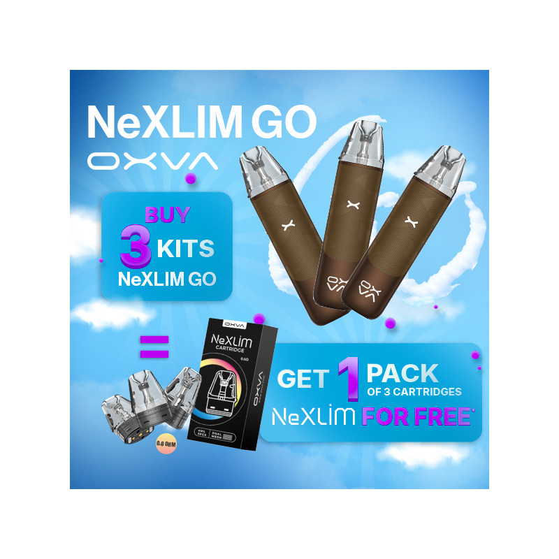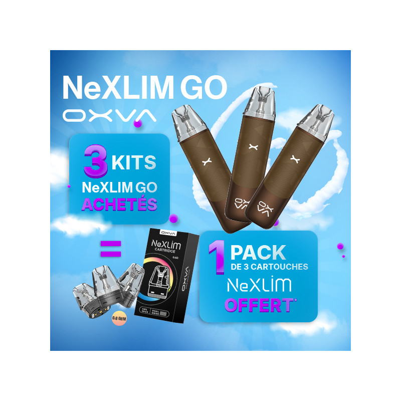 Pour l'achat de 3 Kits NEXLim Go de couleur Silky Coffee, recevez gratuitement* 1 Pack de 3 cartouches NEXLim d'une valeur de 0.6ohm.
