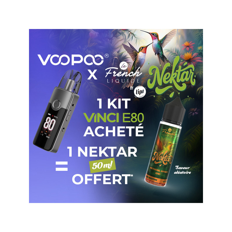 Pour l'achat d'un Kit Vinci E80 (couleur Metal Gray), recevez gratuitement* un liquide 50mL Nektar Le French Liquide by LIPS (saveur aléatoire).