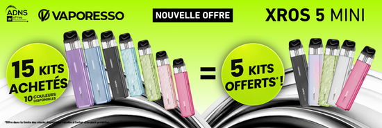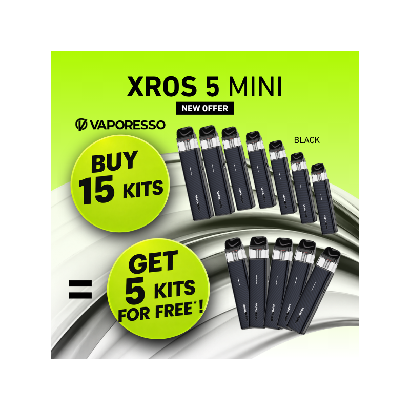 Pour l'achat de 15 Kits XROS 5 Mini de Vaporesso (couleur Black), recevez gratuitement 5 Kits de la même couleur. Soit 20 Kits pour le prix de 15 !